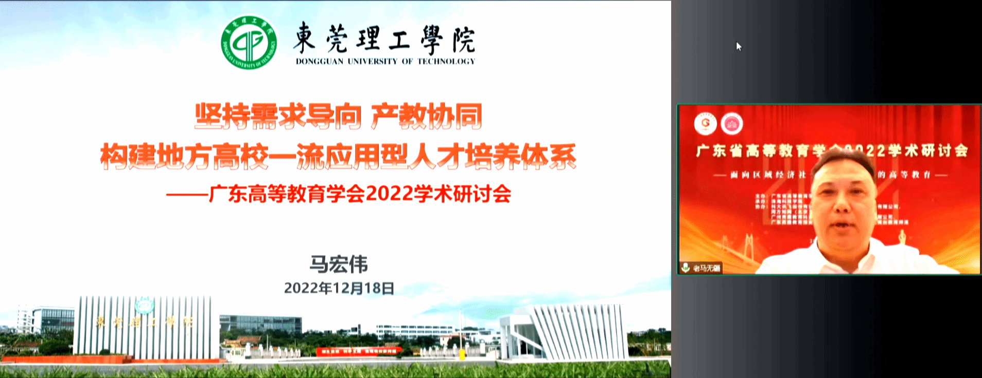 12月18日,广东省高等教育学会2022学术研讨会在珠海市召开。来自省内外高校的主要领导、知名专家学者,高校发规处、教务处、科研处负责人、教师代表,以及教育科研机构、企业负责人、相关专业硕博士研究生等,共同围绕“面向区域经济社会高质量发展的高等教育”这一主题展开深入研讨。我校马宏伟校长应邀参会并在大学校长论坛上作题为“坚持需求导向 产教协同 构建地方高校一流应用型人才培养体系”的报告。