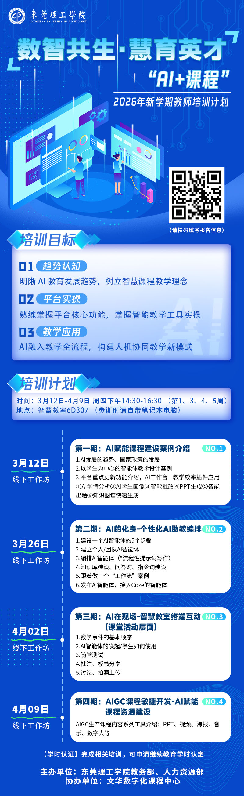 接下来,学校将组织开展融合式智慧教学平台“理论讲解+平台实操”系列线下工作坊培训,进一步提升教师数字化教学能力和智慧课程建设水平。