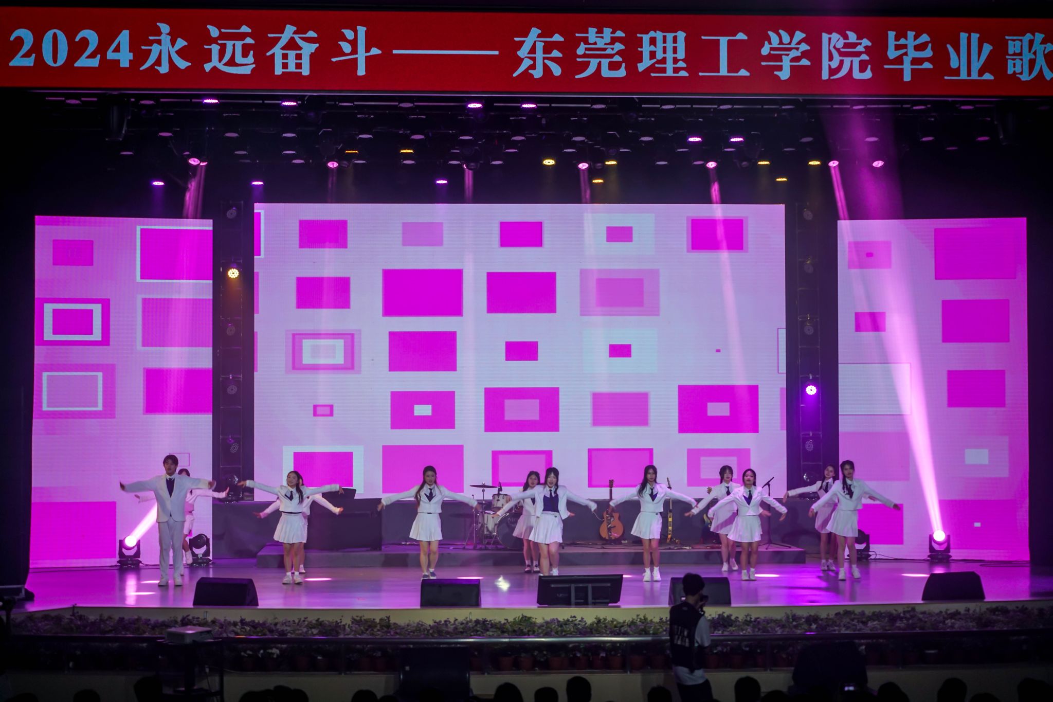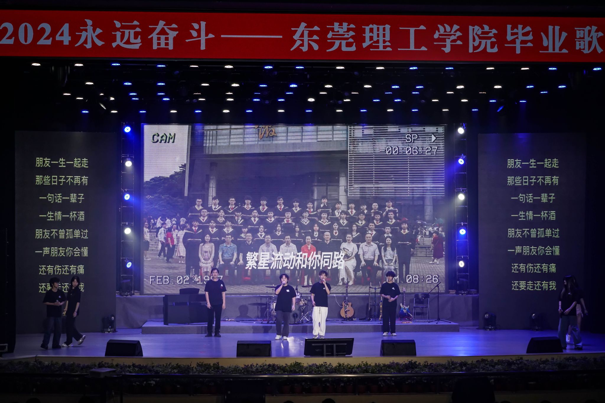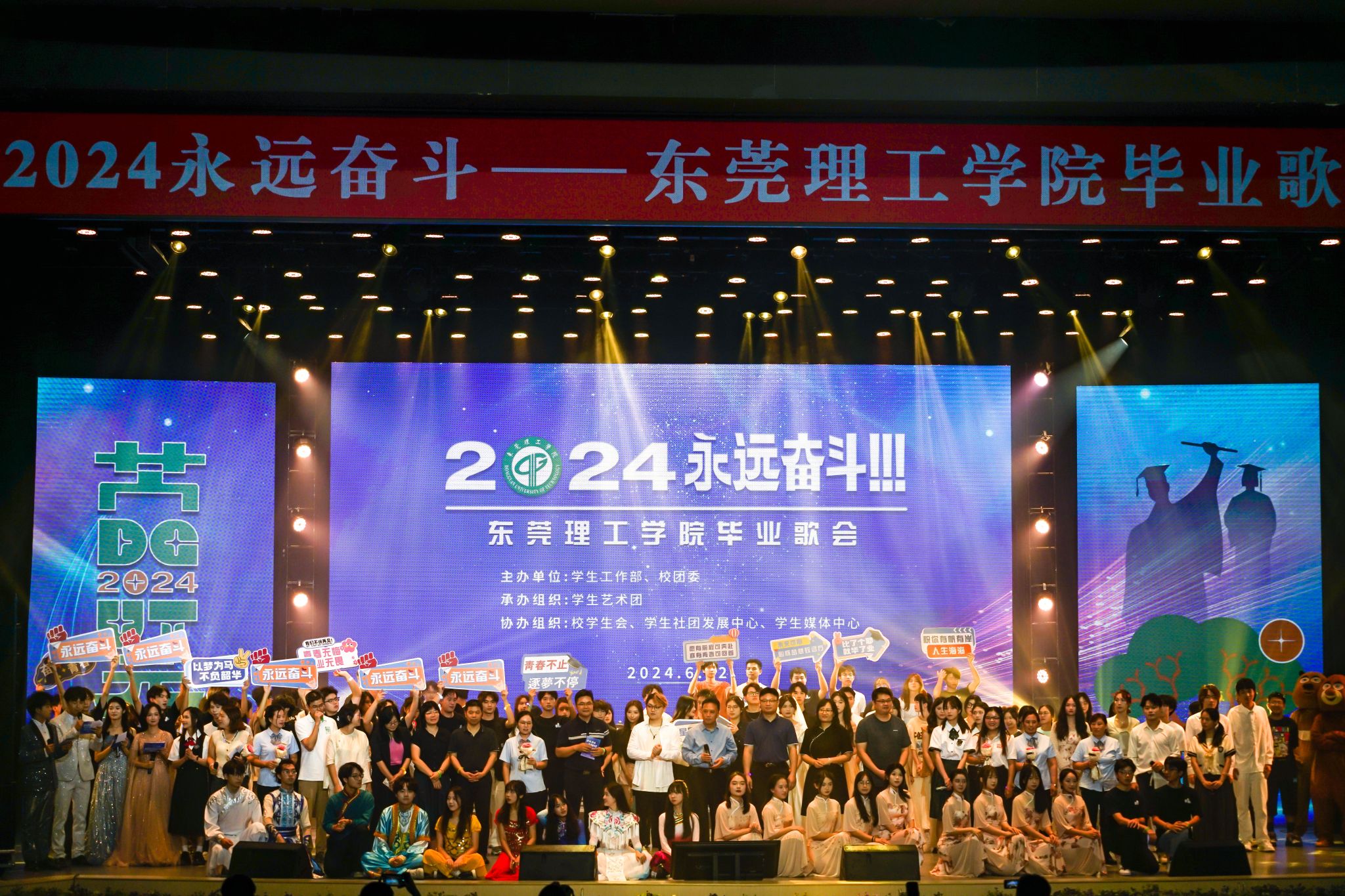 东莞理工学院2024届“永远奋斗”毕业歌会于6月22日晚在大礼堂举行。本次歌会由学生工作部、校团委主办,学生艺术团承办,校学生会、学生社团发展中心、学生媒体中心协办。毕业歌会同步由莞工青年视频号全程直播,线上直播观众总数1.5万人,喝彩次数3.2万人次,在线评论571条,线上分享次数7792次,得到了广大师生和校友的广泛关注。