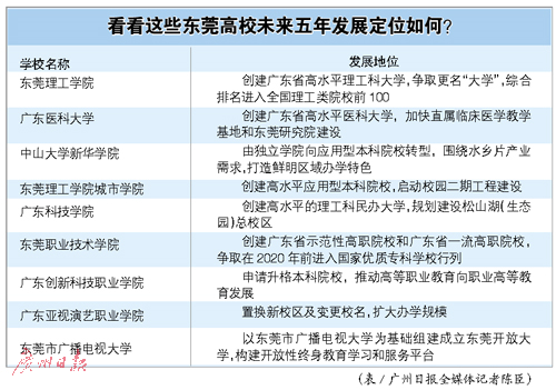 广州日报讯 (全媒体记者陈臣)昨日,市教育局在官网上发布了《东莞市高等教育发展“十三五”规划》(以下简称《规划》),《规划》除了给东莞现有高校进行了发展定位外,还提出未来五年将新建2~3所高校。