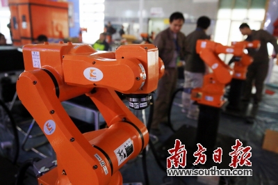 在华南理工大学展区,整齐地摆放了十多台六轴机器人。工作人员告诉记者,该机器人为自主研发,精度在正负0.05毫米之间,具有柔性强、精度高、通用性强、寿命长的特点,可长时间满负载作业,主要应用于机床上下料、搬运、喷涂、装配等工作岗位,适合大多数制造行业。