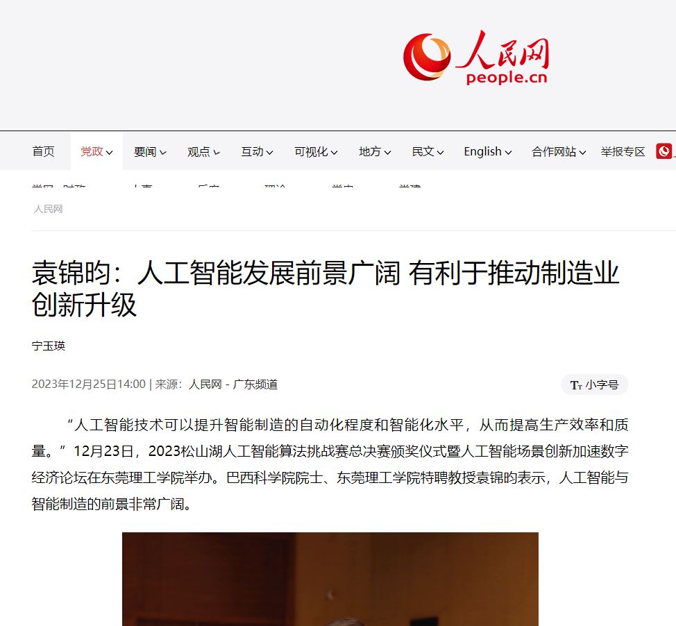 “人工智能技术可以提升智能制造的自动化程度和智能化水平,从而提高生产效率和质量。”12月23日,2023松山湖人工智能算法挑战赛总决赛颁奖仪式暨人工智能场景创新加速数字经济论坛在东莞理工学院举办。巴西科学院院士、东莞理工学院特聘教授袁锦昀表示,人工智能与智能制造的前景非常广阔。