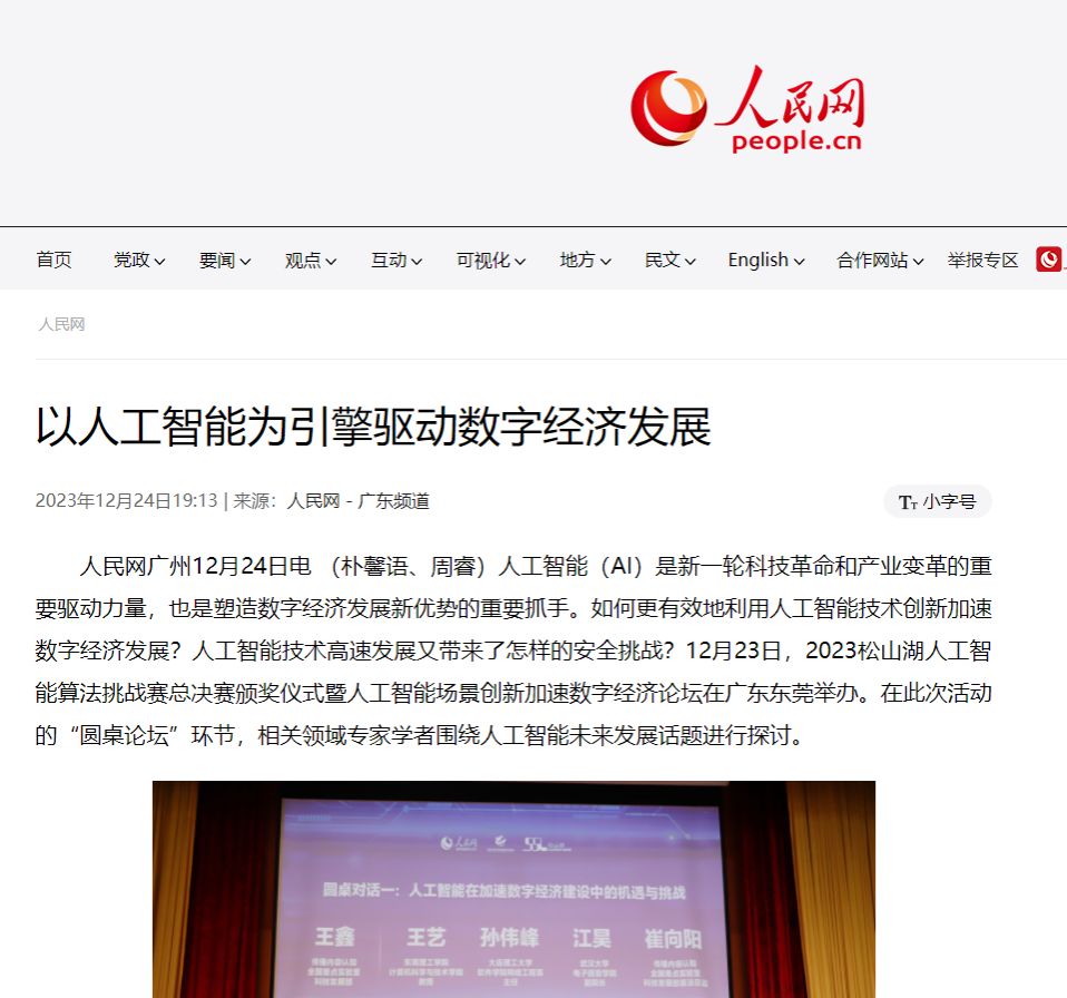 人工智能(AI)是新一轮科技革命和产业变革的重要驱动力量,也是塑造数字经济发展新优势的重要抓手。如何更有效地利用人工智能技术创新加速数字经济发展?人工智能技术高速发展又带来了怎样的安全挑战?12月23日,2023松山湖人工智能算法挑战赛总决赛颁奖仪式暨人工智能场景创新加速数字经济论坛在广东东莞举办。在此次活动的“圆桌论坛”环节,相关领域专家学者围绕人工智能未来发展话题进行探讨。