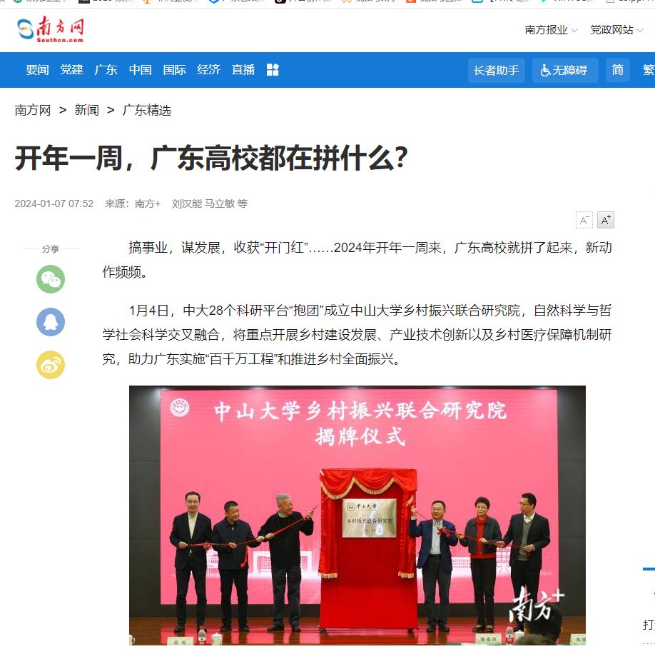 1月4日,中大28个科研平台“抱团”成立中山大学乡村振兴联合研究院,自然科学与哲学社会科学交叉融合,将重点开展乡村建设发展、产业技术创新以及乡村医疗保障机制研究,助力广东实施“百千万工程”和推进乡村全面振兴。