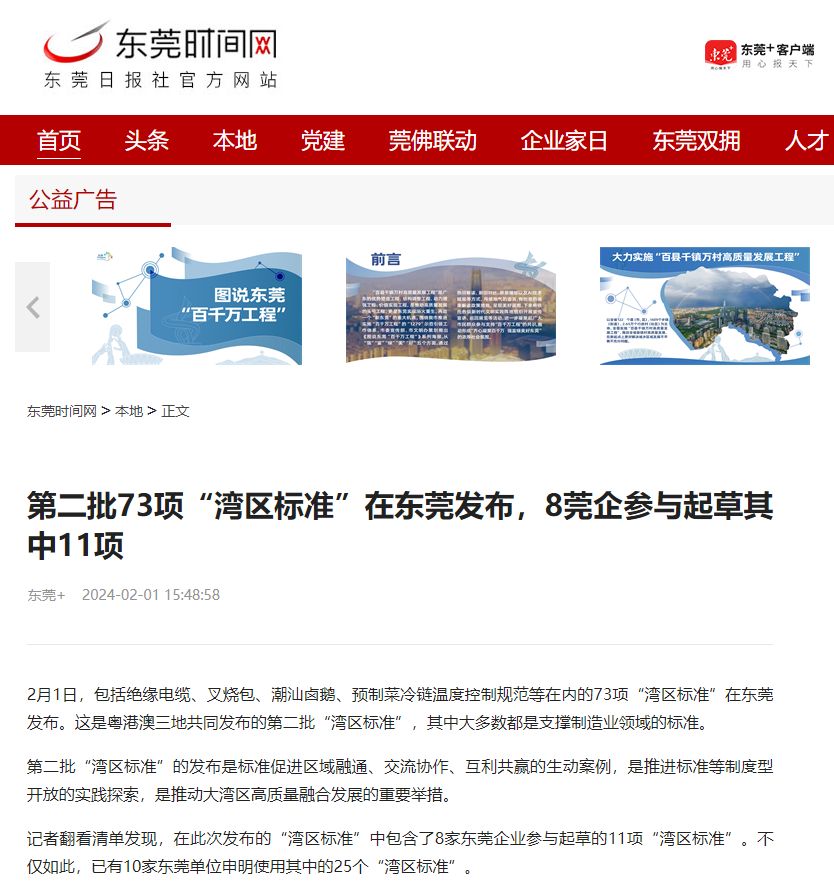 2月1日,包括绝缘电缆、叉烧包、潮汕卤鹅、预制菜冷链温度控制规范等在内的73项“湾区标准”在东莞发布。这是粤港澳三地共同发布的第二批“湾区标准”,其中大多数都是支撑制造业领域的标准。