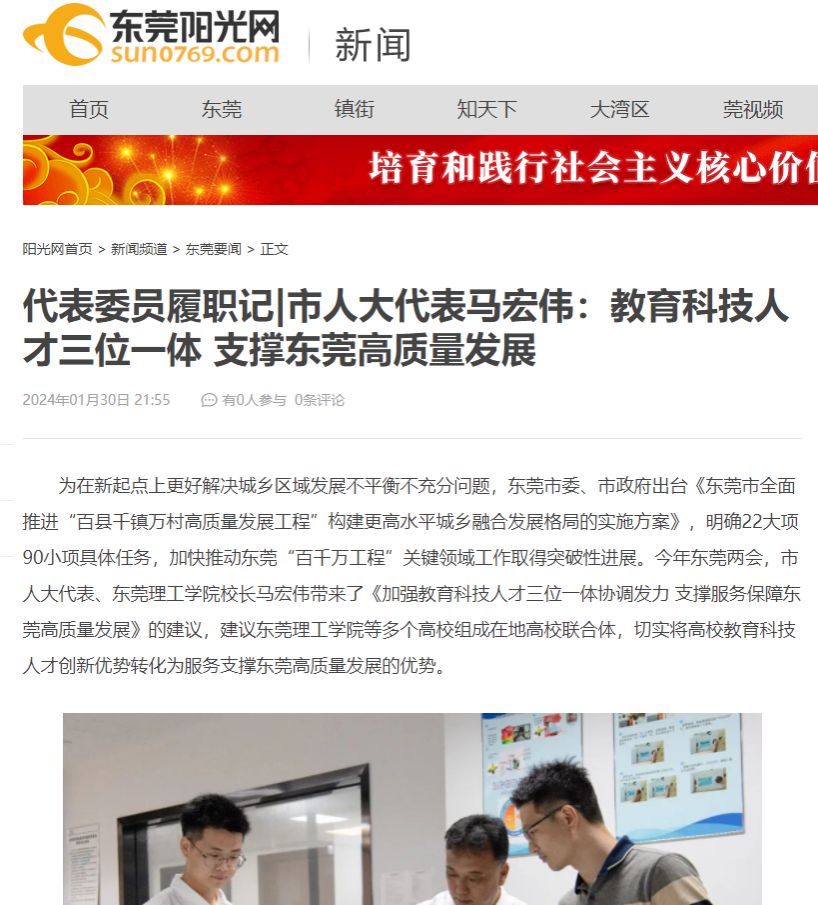 为在新起点上更好解决城乡区域发展不平衡不充分问题,东莞市委、市政府出台《东莞市全面推进“百县千镇万村高质量发展工程”构建更高水平城乡融合发展格局的实施方案》,明确22大项90小项具体任务,加快推动东莞“百千万工程”关键领域工作取得突破性进展。今年东莞两会,市人大代表、东莞理工学院校长马宏伟带来了《加强教育科技人才三位一体协调发力 支撑服务保障东莞高质量发展》的建议,建议东莞理工学院等多个高校组成在地高校联合体,切实将高校教育科技人才创新优势转化为服务支撑东莞高质量发展的优势。