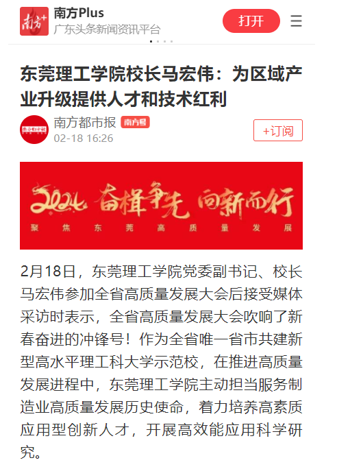 2月18日,东莞理工学院党委副书记、校长马宏伟参加全省高质量发展大会后接受媒体采访时表示,全省高质量发展大会吹响了新春奋进的冲锋号!作为全省唯一省市共建新型高水平理工科大学示范校,在推进高质量发展进程中,东莞理工学院主动担当服务制造业高质量发展历史使命,着力培养高素质应用型创新人才,开展高效能应用科学研究。