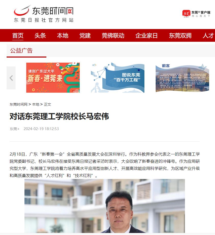 2月18日,广东“新春第一会”全省高质量发展大会在深圳举行。作为科教界参会代表之一的东莞理工学院党委副书记、校长马宏伟在接受东莞日报记者采访时表示,大会吹响了新春奋进的冲锋号。作为应用研究型大学,东莞理工学院将着力培养高水平应用型创新人才、开展高效能应用科学研究,为区域产业升级和高质量发展提供“人才红利”和“技术红利”。2024年,学校将全面启动实施“东莞理工学院服务支撑东莞高质量发展专项行动”,汇聚教育科技人才强大合力,服务国家战略,匹配区域发展需求,为广东省、东莞市高质量发展提供支撑,为大湾区创新驱动发展服务。