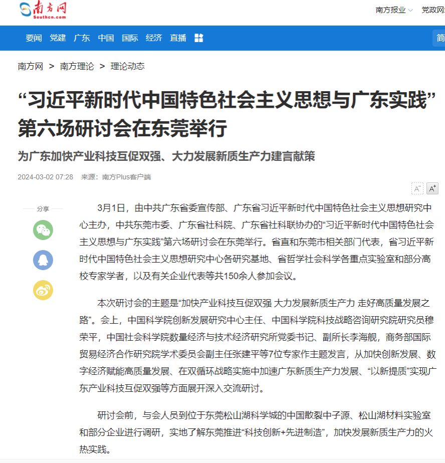 研讨会前,与会人员到位于东莞松山湖科学城的中国散裂中子源、松山湖材料实验室和部分企业进行调研,实地了解东莞推进“科技创新+先进制造”,加快发展新质生产力的火热实践。研讨会现场