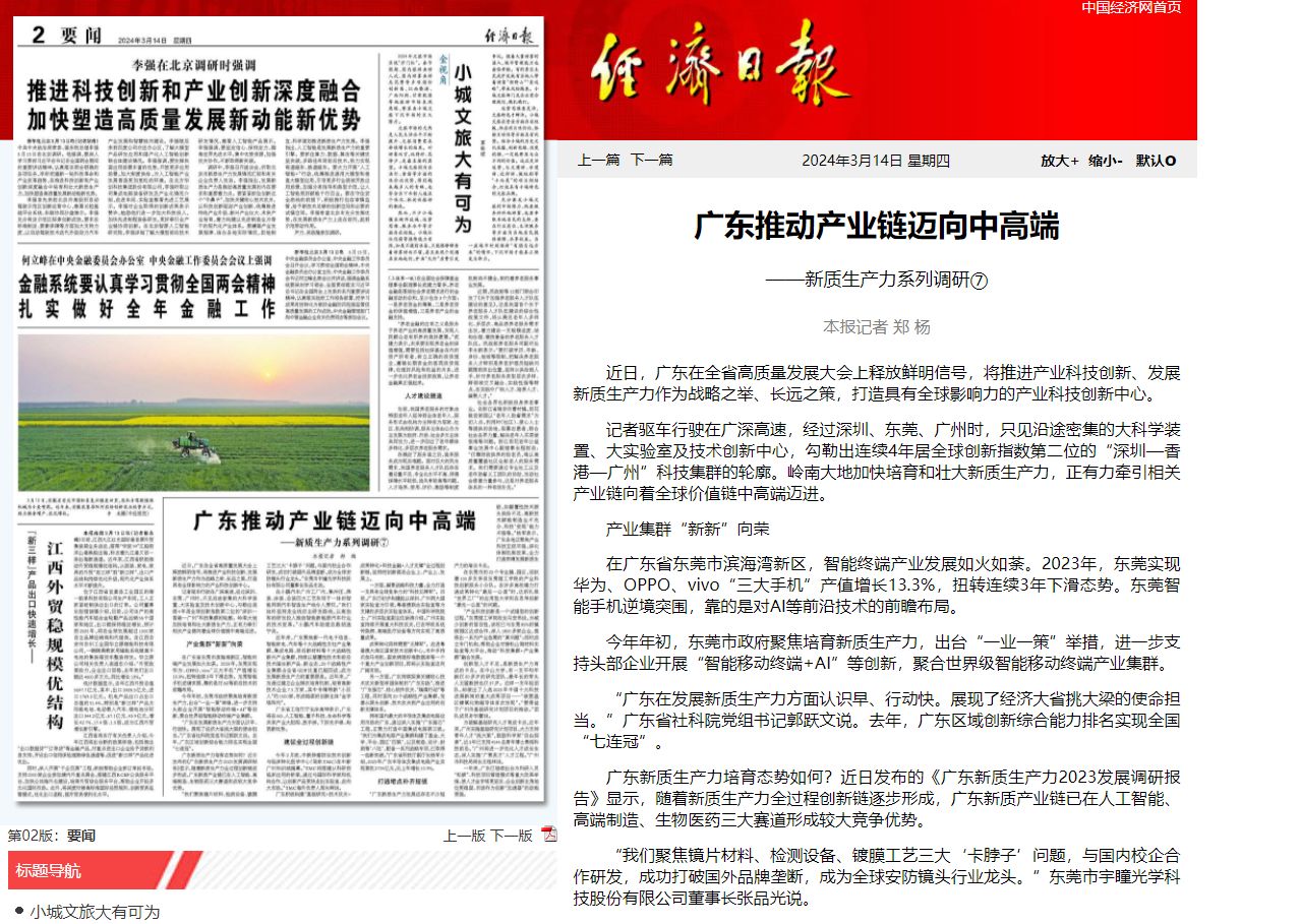 “我们聚焦镜片材料、检测设备、镀膜工艺三大‘卡脖子’问题,与国内校企合作研发,成功打破国外品牌垄断,成为全球安防镜头行业龙头。”东莞市宇瞳光学科技股份有限公司董事长张品光说。