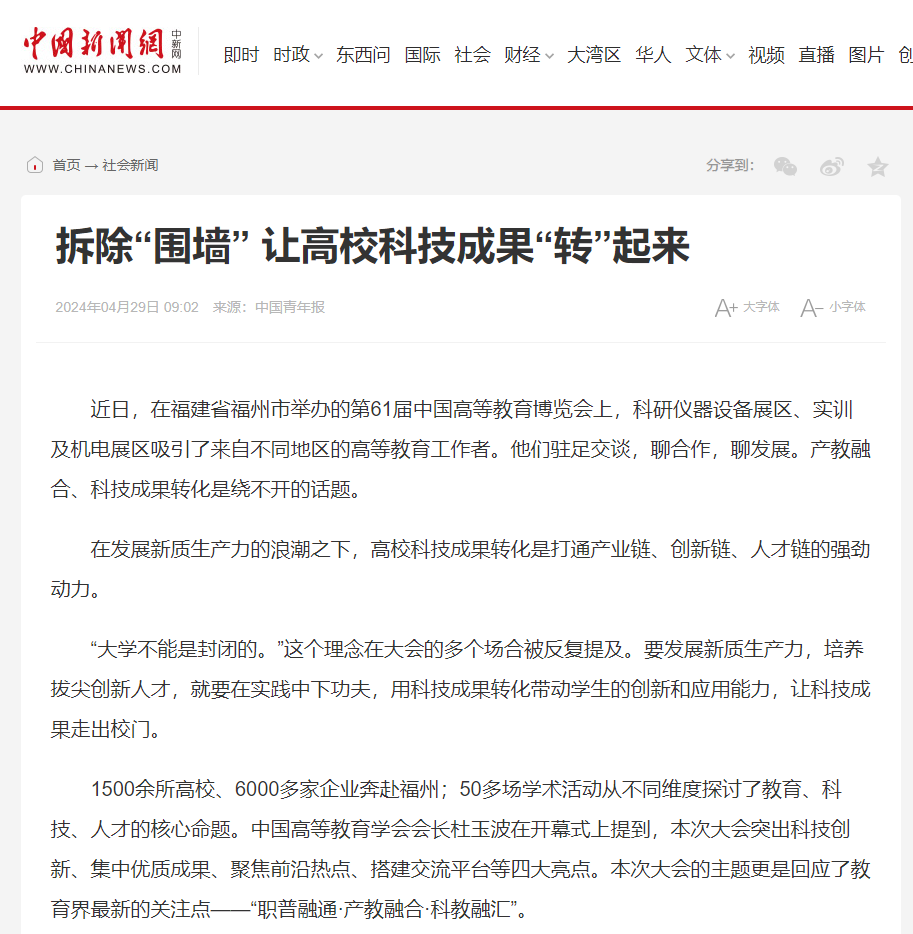 近日,在福建省福州市举办的第61届中国高等教育博览会上,科研仪器设备展区、实训及机电展区吸引了来自不同地区的高等教育工作者。他们驻足交谈,聊合作,聊发展。产教融合、科技成果转化是绕不开的话题。