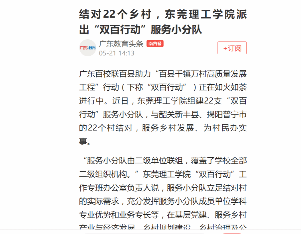 广东百校联百县助力“百县千镇万村高质量发展工程”行动(下称“双百行动”)正在如火如荼进行中。近日,东莞理工学院组建22支“双百行动”服务小分队,与韶关新丰县、揭阳普宁市的22个村结对,服务乡村发展、为村民办实事。
