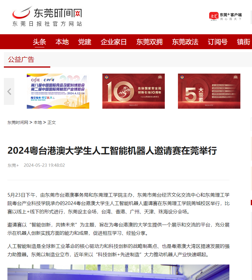 5月23日下午,由东莞市台港澳事务局和东莞理工学院主办,东莞市莞台经济文化交流中心和东莞理工学院粤台产业科技学院承办的2024粤台港澳大学生人工智能机器人邀请赛在东莞理工学院莞城校区举行,比赛以线上+线下的形式进行,东莞设主会场,台湾、香港、广州、天津、珠海设分会场。