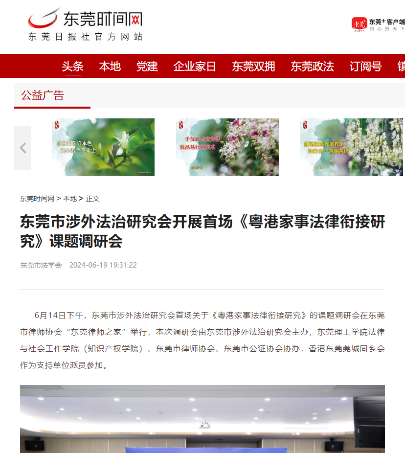 6月14日下午,东莞市涉外法治研究会首场关于《粤港家事法律衔接研究》的课题调研会在东莞市律师协会“东莞律师之家”举行,本次调研会由东莞市涉外法治研究会主办,东莞理工学院法律与社会工作学院(知识产权学院)、东莞市律师协会、东莞市公证协会协办,香港东莞莞城同乡会作为支持单位派员参加。