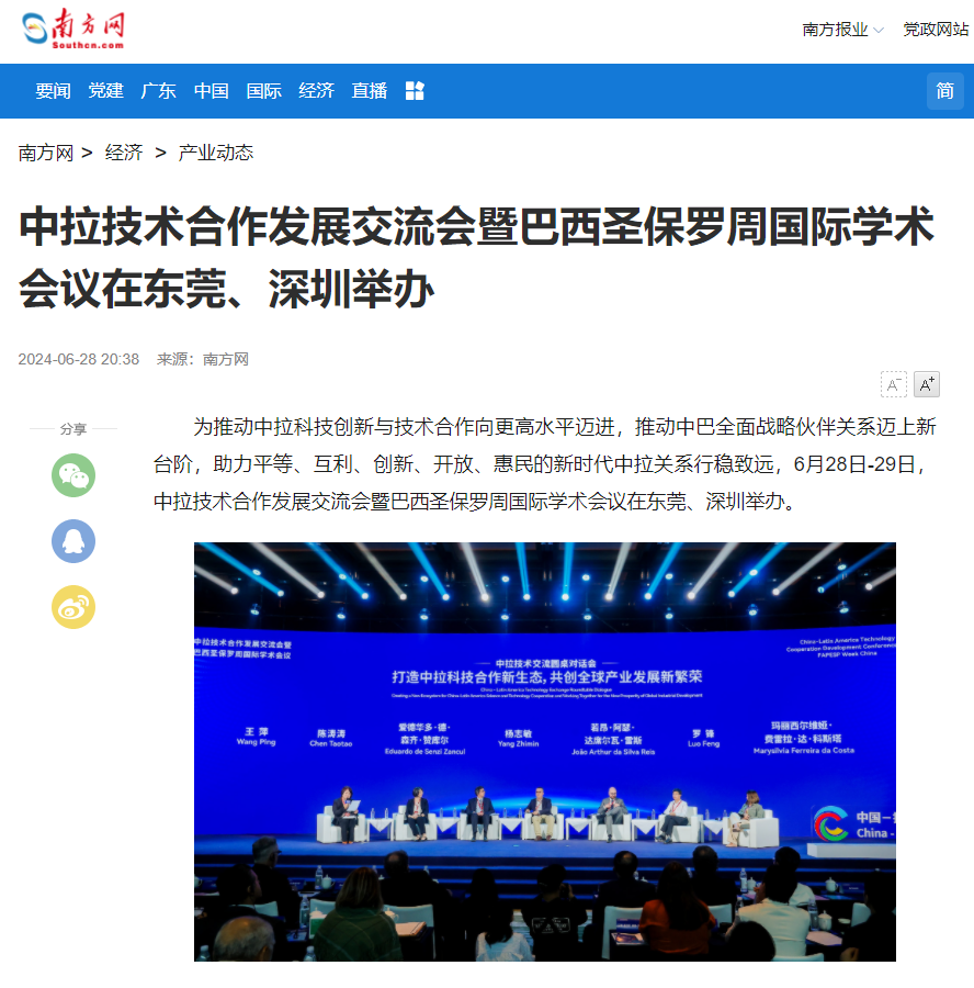 为推动中拉科技创新与技术合作向更高水平迈进,推动中巴全面战略伙伴关系迈上新台阶,助力平等、互利、创新、开放、惠民的新时代中拉关系行稳致远,6月28日-29日,中拉技术合作发展交流会暨巴西圣保罗周国际学术会议在东莞、深圳举办。