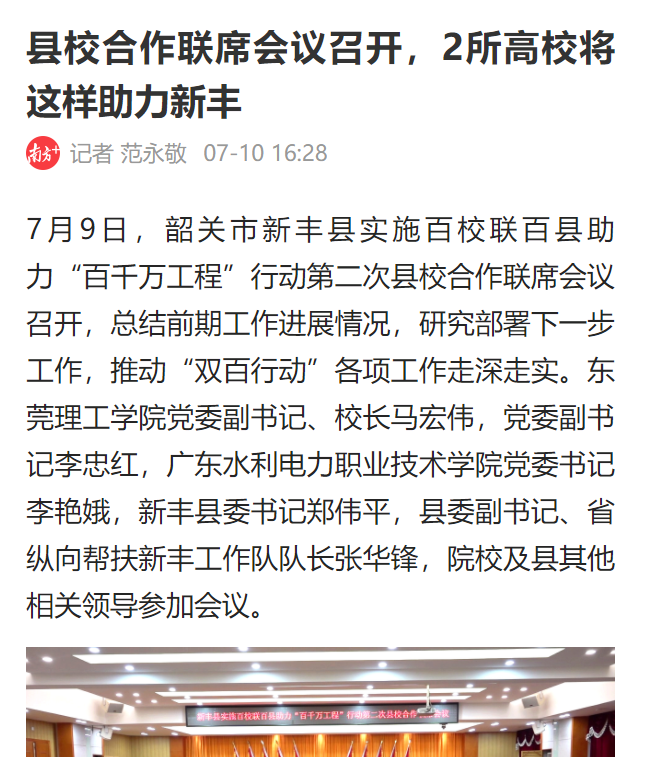 郑伟平代表新丰县委、县政府对东莞理工学院、广东水利电力职业技术学院给予新丰的大力帮扶表示衷心感谢。他表示,希望三方进一步加强沟通,抢抓县校结对共建机遇,进一步深化和完善帮扶机制,强化县镇村发展的人才、智力和科技支撑。同时,深化产业共建共融,助力现代农业、低空经济、汽配等产业发展壮大,促进县域经济高质量发展;赋能新型城镇化和乡村全面振兴,共同写好“山、水、田”文章,促进城乡区域协调发展;聚力推动改革创新,进一步激发县镇村发展活力,在创新举措、形成示范上探索可复制推广的合作模式,全力推进“双百行动”在新丰走深走实,结出更丰硕成果。