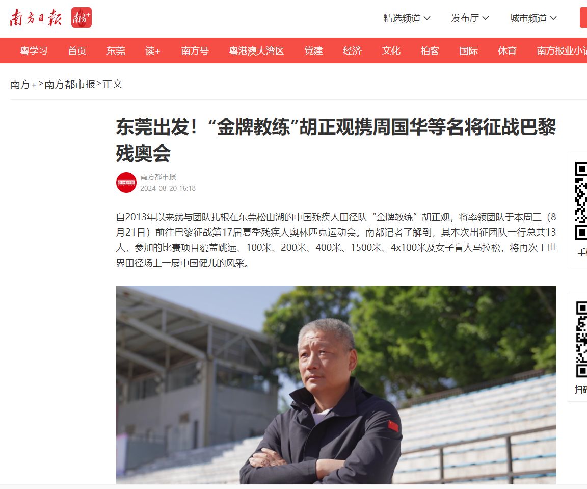 自2013年以来就与团队扎根在东莞松山湖的中国残疾人田径队“金牌教练”胡正观,将率领团队于本周三(8月21日)前往巴黎征战第17届夏季残疾人奥林匹克运动会。南都记者了解到,其本次出征团队一行总共13人,参加的比赛项目覆盖跳远、100米、200米、400米、1500米、4x100米及女子盲人马拉松,将再次于世界田径场上一展中国健儿的风采。