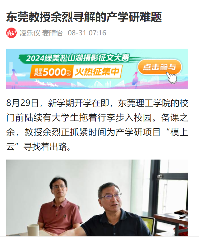 8月29日,新学期开学在即,东莞理工学院的校门前陆续有大学生拖着行李步入校园。备课之余,教授余烈正抓紧时间为产学研项目“模上云”寻找着出路。