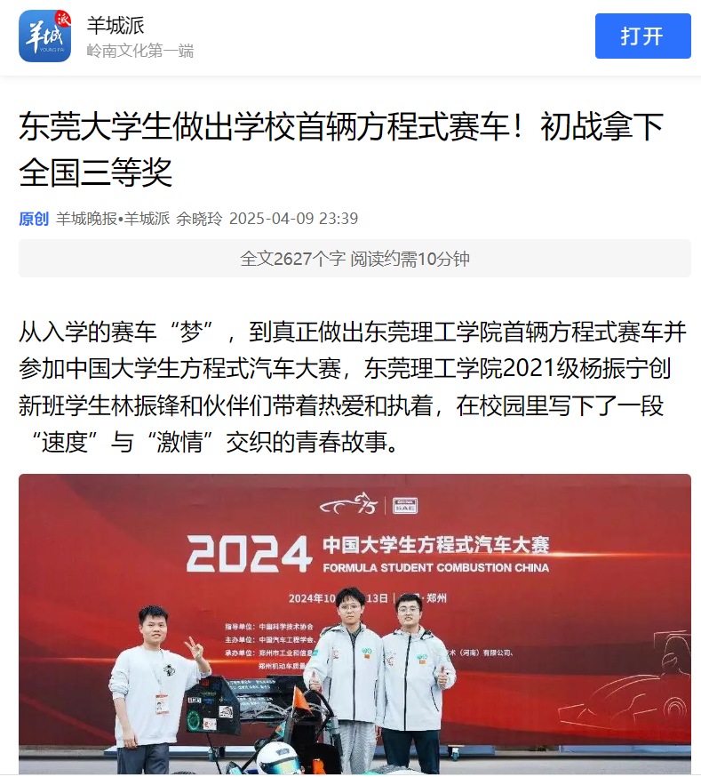 从入学的赛车“梦”,到真正做出东莞理工学院首辆方程式赛车并参加中国大学生方程式汽车大赛,东莞理工学院2021级杨振宁创新班学生林振锋和伙伴们带着热爱和执着,在校园里写下了一段“速度”与“激情”交织的青春故事。