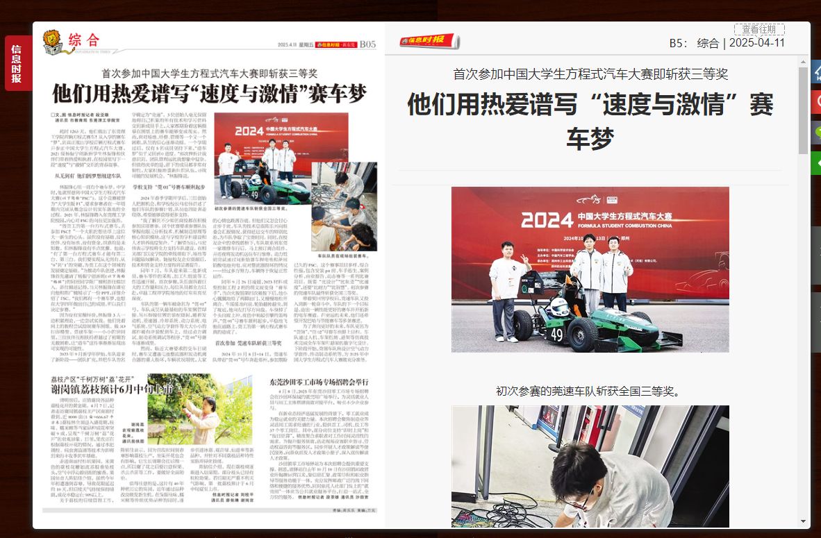 林振锋心里一直有个赛车梦。中学时,他就留意到中国大学生方程式汽车大赛(以下简称“FSC”)。这个竞赛被誉为“大学生版F1”,要求参赛者在一年周期内完成从概念设计到实车落地的全过程。2021年,林振锋踏入东莞理工学院校园,内心对FSC的向往更加强烈。
