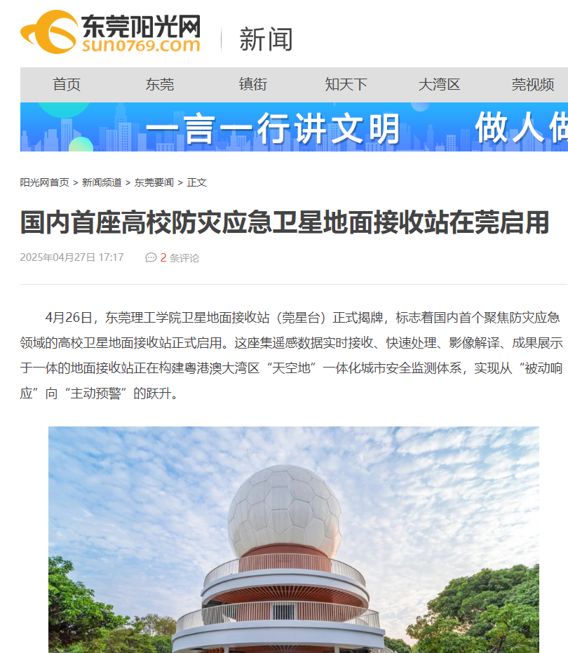 4月26日,东莞理工学院卫星地面接收站(莞星台)正式揭牌,标志着国内首个聚焦防灾应急领域的高校卫星地面接收站正式启用。这座集遥感数据实时接收、快速处理、影像解译、成果展示于一体的地面接收站正在构建粤港澳大湾区“天空地”一体化城市安全监测体系,实现从“被动响应”向“主动预警”的跃升。