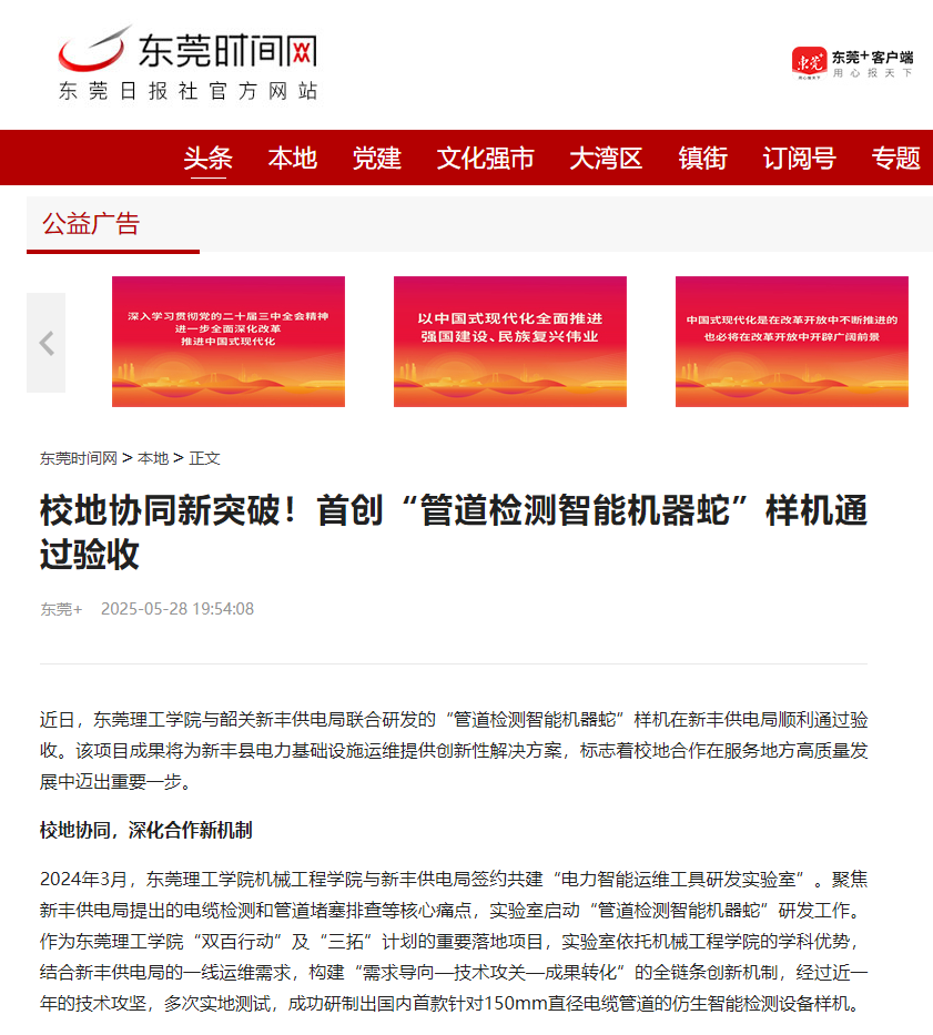 2024年3月,东莞理工学院机械工程学院与新丰供电局签约共建“电力智能运维工具研发实验室”。聚焦新丰供电局提出的电缆检测和管道堵塞排查等核心痛点,实验室启动“管道检测智能机器蛇”研发工作。作为东莞理工学院“双百行动”及“三拓”计划的重要落地项目,实验室依托机械工程学院的学科优势,结合新丰供电局的一线运维需求,构建“需求导向—技术攻关—成果转化”的全链条创新机制,经过近一年的技术攻坚,多次实地测试,成功研制出国内首款针对150mm直径电缆管道的仿生智能检测设备样机。