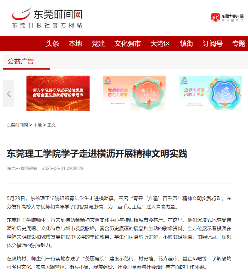 5月29日,东莞理工学院组织青年学生走进横沥镇,开展“青春‘乡遇’百千万”精神文明实践行动,充分发挥高校人才优势和青年学子的智慧与激情,为“百千万工程”注入青春力量。