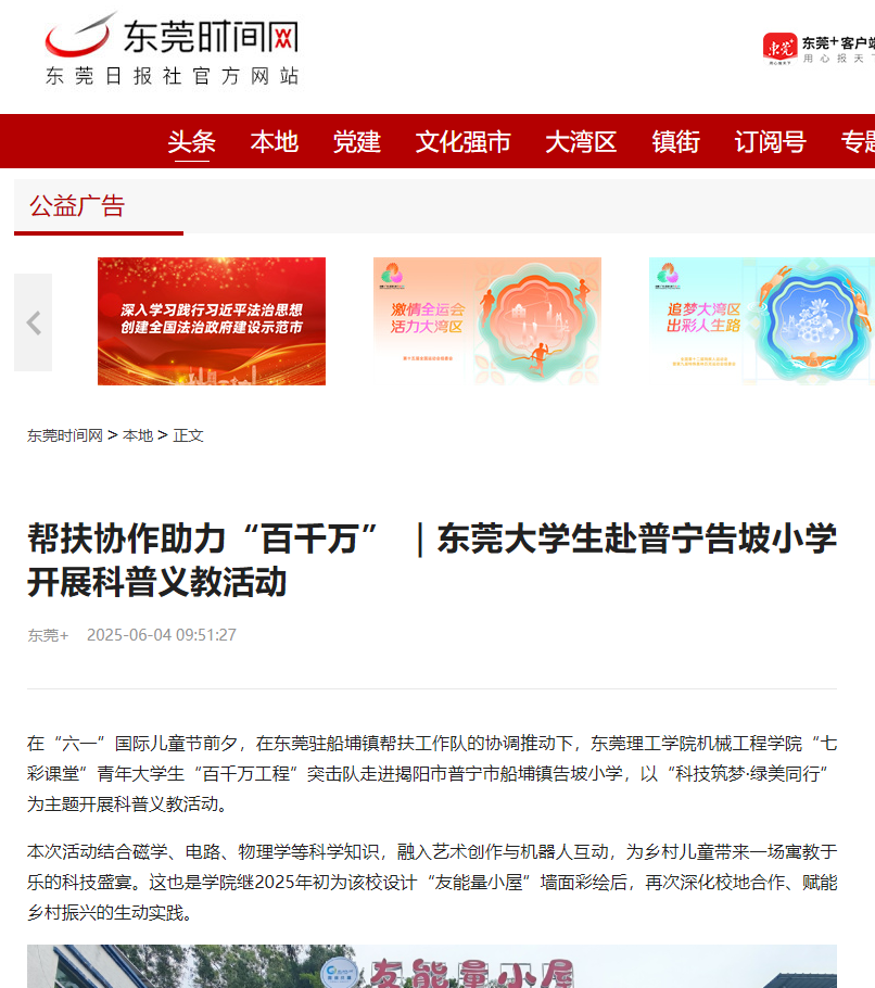 在“六一”国际儿童节前夕,在东莞驻船埔镇帮扶工作队的协调推动下,东莞理工学院机械工程学院“七彩课堂”青年大学生“百千万工程”突击队走进揭阳市普宁市船埔镇告坡小学,以“科技筑梦·绿美同行”为主题开展科普义教活动。
