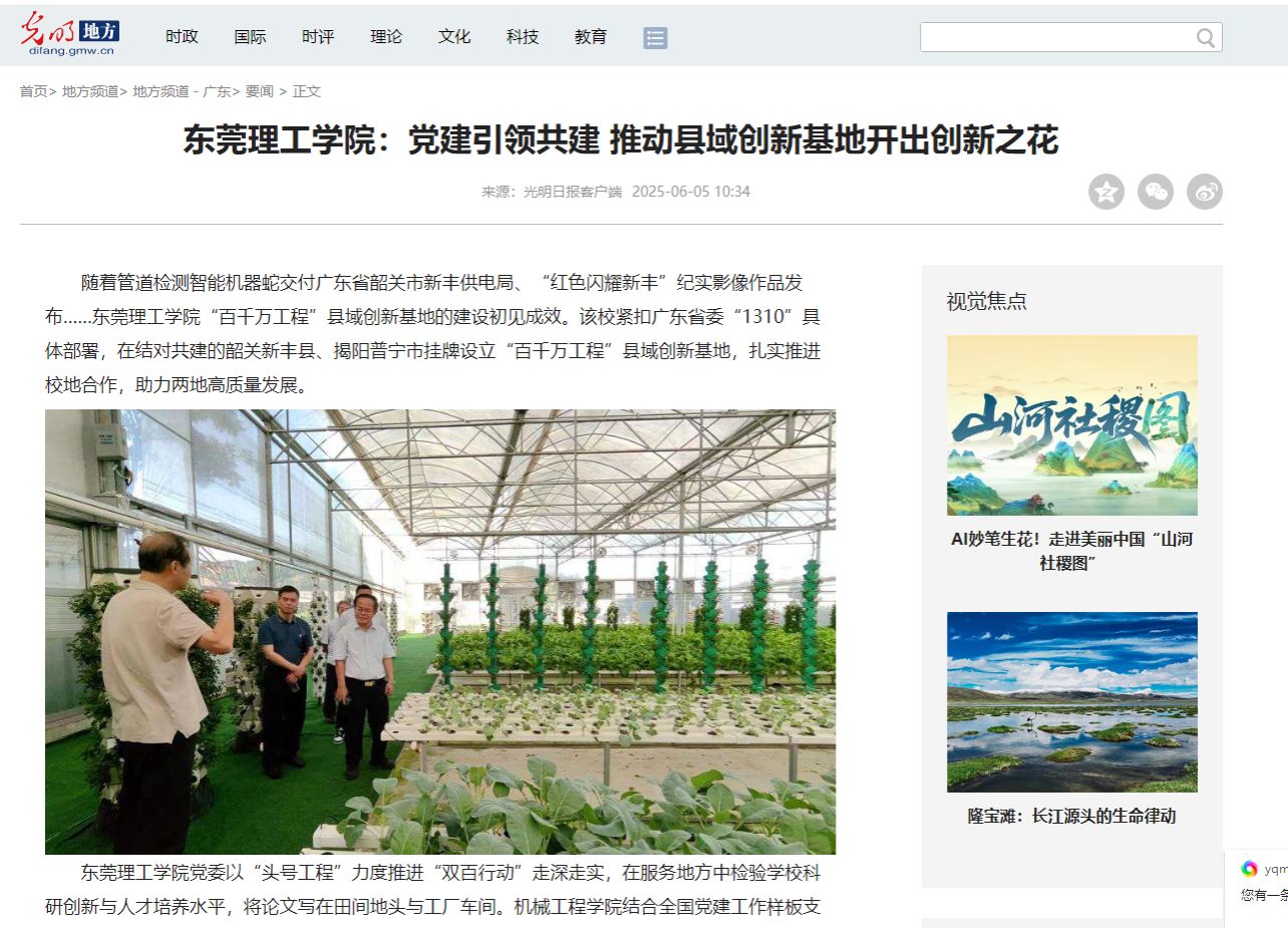 随着管道检测智能机器蛇交付广东省韶关市新丰供电局、“红色闪耀新丰”纪实影像作品发布……东莞理工学院“百千万工程”县域创新基地的建设初见成效。该校紧扣广东省委“1310”具体部署,在结对共建的韶关新丰县、揭阳普宁市挂牌设立“百千万工程”县域创新基地,扎实推进校地合作,助力两地高质量发展。