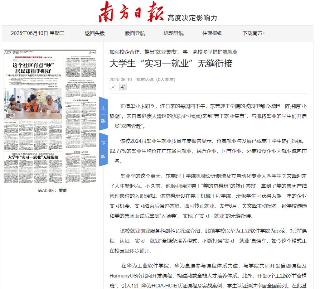 该校就业创业服务科副科长徐斌介绍,此前学校以华为工业软件学院为示范,打造“课程—认证—实习—就业”全链条培养模式,不断打通“实习—就业”直通车,如今这个模式正在校园里逐步铺开。