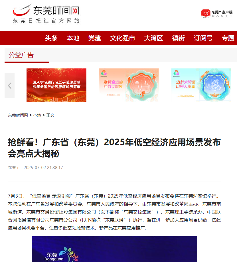7月3日,“低空场景 示范引领”广东省(东莞)2025年低空经济应用场景发布会将在东莞迎宾馆举行。本次活动在广东省发展和改革委员会、东莞市人民政府的指导下,由东莞市发展和改革局主办,东莞市南城街道、东莞市交通投资控股集团有限公司(以下简称“东莞交控集团”)、东莞理工学院承办,中国联合网络通信有限公司东莞市分公司(以下简称“东莞联通”)执行,旨在进一步加大应用场景供给,搭建应用场景机会平台,让更多低空领域新技术、新产品在东莞应用推广。