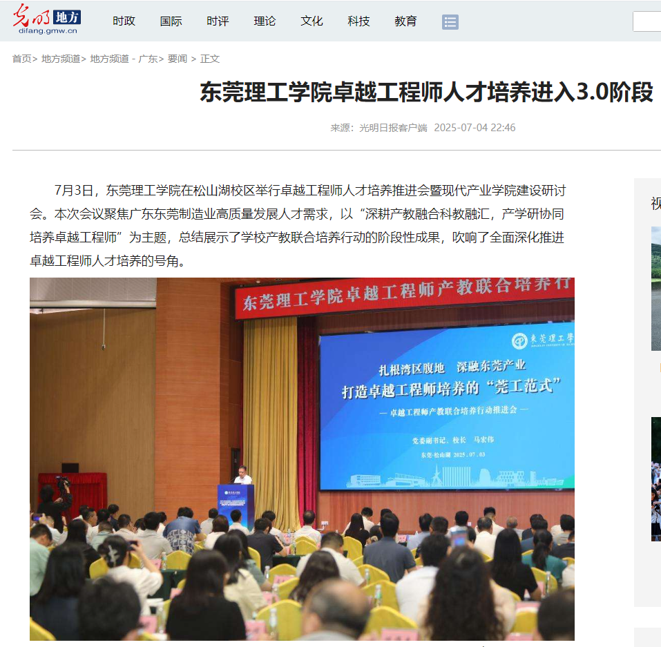 据了解,东莞理工学院于 2022 年 7 月发布《东莞理工学院新时代卓越工程师产教联合培养行动实施方案》。通过把握重点产业紧缺人才需求、做实产学合作协同育人机制、实施紧缺人才培养 “奋楫计划”等 10 大举措,加速推进卓越工程师教育培养改革。经过三年实践,初步迭代出具有 “莞工特色” 的卓越工程师人才培养新体系。校党委副书记、校长马宏伟在《打造卓越工程师培养的“莞工范式”》报告中全面总结了学校在卓越工程师人才培养工作的经验思路和成果成效。
