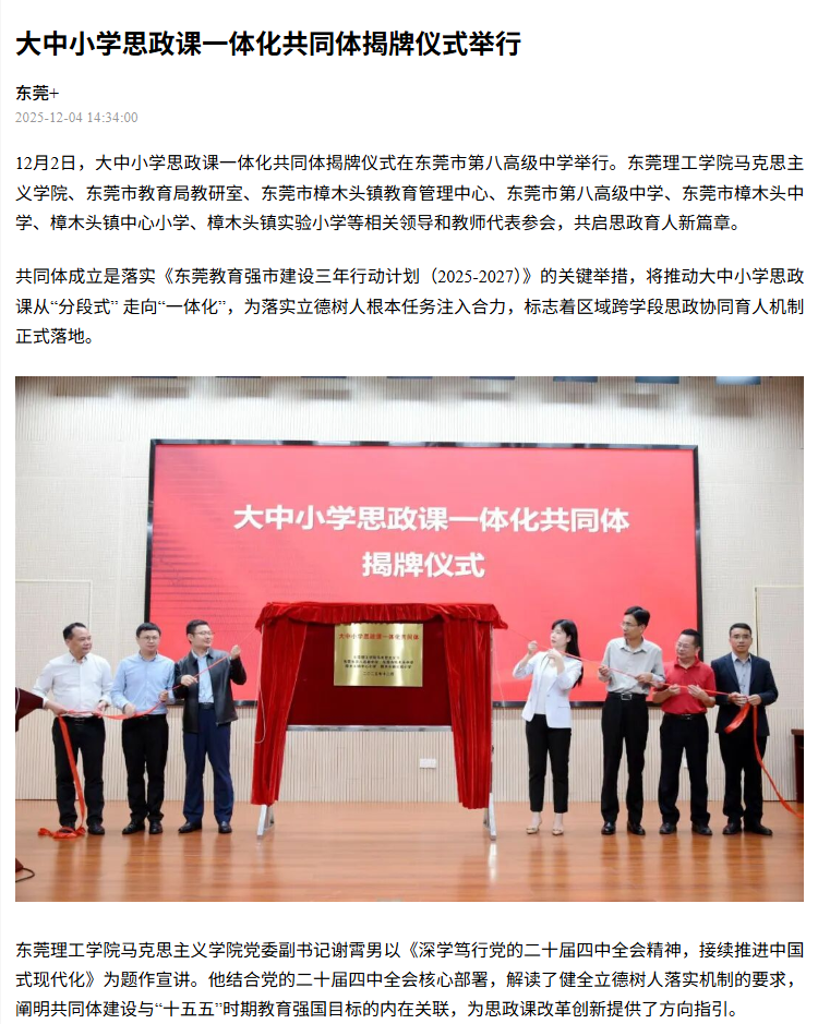 共同体成立是落实《东莞教育强市建设三年行动计划(2025-2027)》的关键举措,将推动大中小学思政课从“分段式” 走向“一体化”,为落实立德树人根本任务注入合力,标志着区域跨学段思政协同育人机制正式落地。