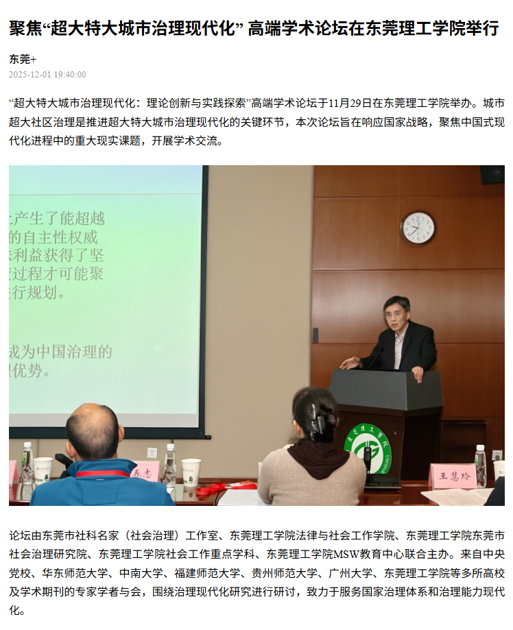 “超大特大城市治理现代化:理论创新与实践探索”高端学术论坛于11月29日在东莞理工学院举办。城市超大社区治理是推进超大特大城市治理现代化的关键环节,本次论坛旨在响应国家战略,聚焦中国式现代化进程中的重大现实课题,开展学术交流。