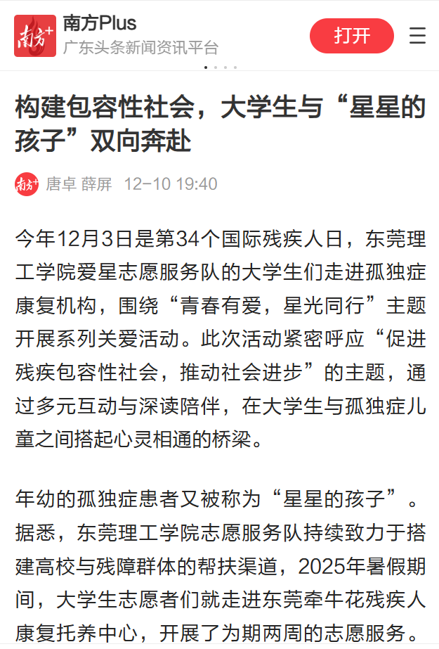今年12月3日是第34个国际残疾人日,东莞理工学院爱星志愿服务队的大学生们走进孤独症康复机构,围绕“青春有爱,星光同行”主题开展系列关爱活动。此次活动紧密呼应“促进残疾包容性社会,推动社会进步”的主题,通过多元互动与深读陪伴,在大学生与孤独症儿童之间搭起心灵相通的桥梁。
