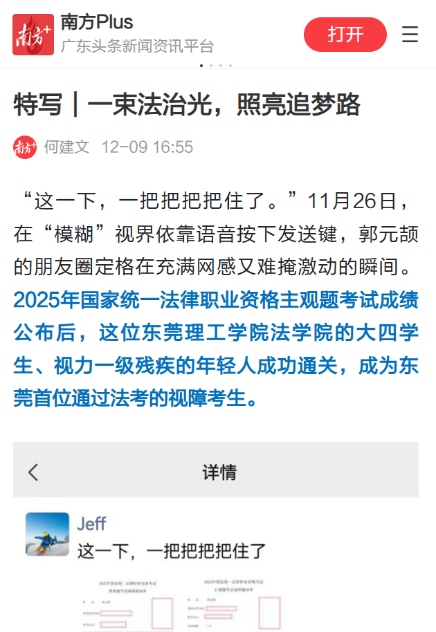 “这一下,一把把把把住了。”11月26日,在“模糊”视界依靠语音按下发送键,郭元颉的朋友圈定格在充满网感又难掩激动的瞬间。2025年国家统一法律职业资格主观题考试成绩公布后,这位东莞理工学院法学院的大四学生、视力一级残疾的年轻人成功通关,成为东莞首位通过法考的视障考生。