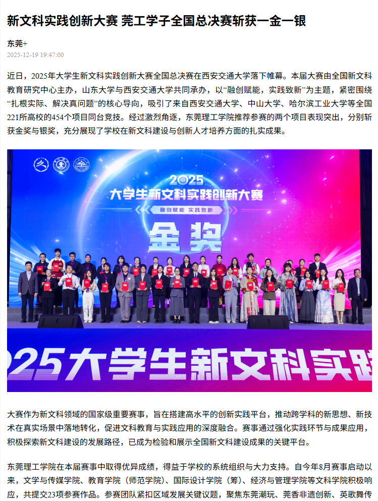 此次国赛“一金一银”的佳绩,既是学校持续推进新文科建设结出的硕果,也是各文科学院创新人才培养模式的有力印证。当前,东莞理工学院以独特的“理工底色”与“湾区视角”,深入开展人文社会科学革新实践。通过深化通识教育改革、构建“六加强六引导”文科人才培养模式,学校将新文科建设打造为提升应用研究型大学“巧实力”与“软实力”的核心引擎,持续为粤港澳大湾区的经济社会文化发展输送高素质人才、提供坚实智力支撑。