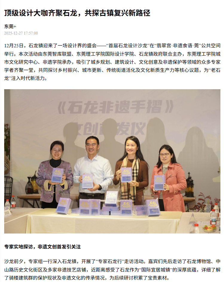 12月25日,石龙镇迎来了一场设计界的盛会——“首届石龙设计沙龙”在“翡翠宫·非遗食语·莞”公共空间举行。本次活动由东莞智库联盟、东莞理工学院国际设计学院、石龙镇政府联合主办,东莞理工学院城市文化研究中心、非遗学院承办,吸引了城乡规划、建筑设计、文化创意及非遗保护等领域的众多专家学者齐聚一堂,共同探讨乡村振兴、城市更新、传统街道活化及文化新质生产力等核心议题,为“老石龙”注入时代新活力。