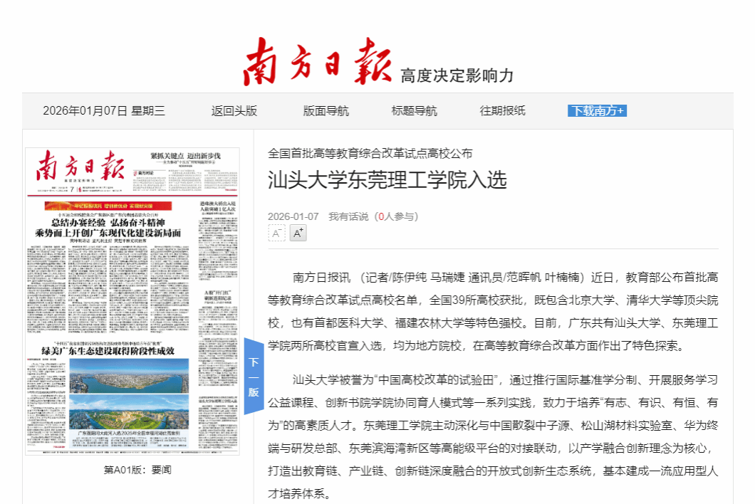 近日,教育部公布首批高等教育综合改革试点高校名单,全国39所高校获批,既包含北京大学、清华大学等顶尖院校,也有首都医科大学、福建农林大学等特色强校。目前,广东共有汕头大学、东莞理工学院两所高校官宣入选,均为地方院校,在高等教育综合改革方面作出了特色探索。