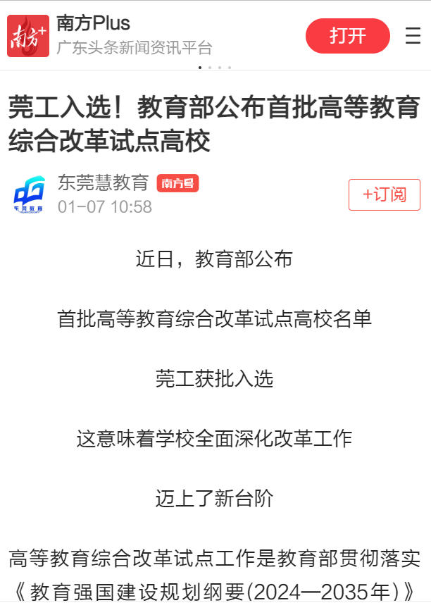 接下来,莞工将以本次改革为重要契机,通过三年建设期,全面深化新工科建设,构建重点产业领域急需人才培养新机制;深推教赛联动、专创融合,打造拔尖创新创业人才培养体系;面向未来工程人才培养,融汇学校长期积累的产教资源,重塑高等教育新形态。力争在深度赋能区域发展、整体提升人才培养能力的基础上,打造更具标杆引领作用的卓越工程师培养体系,为区域产业发展输送更多高素质应用型人才。