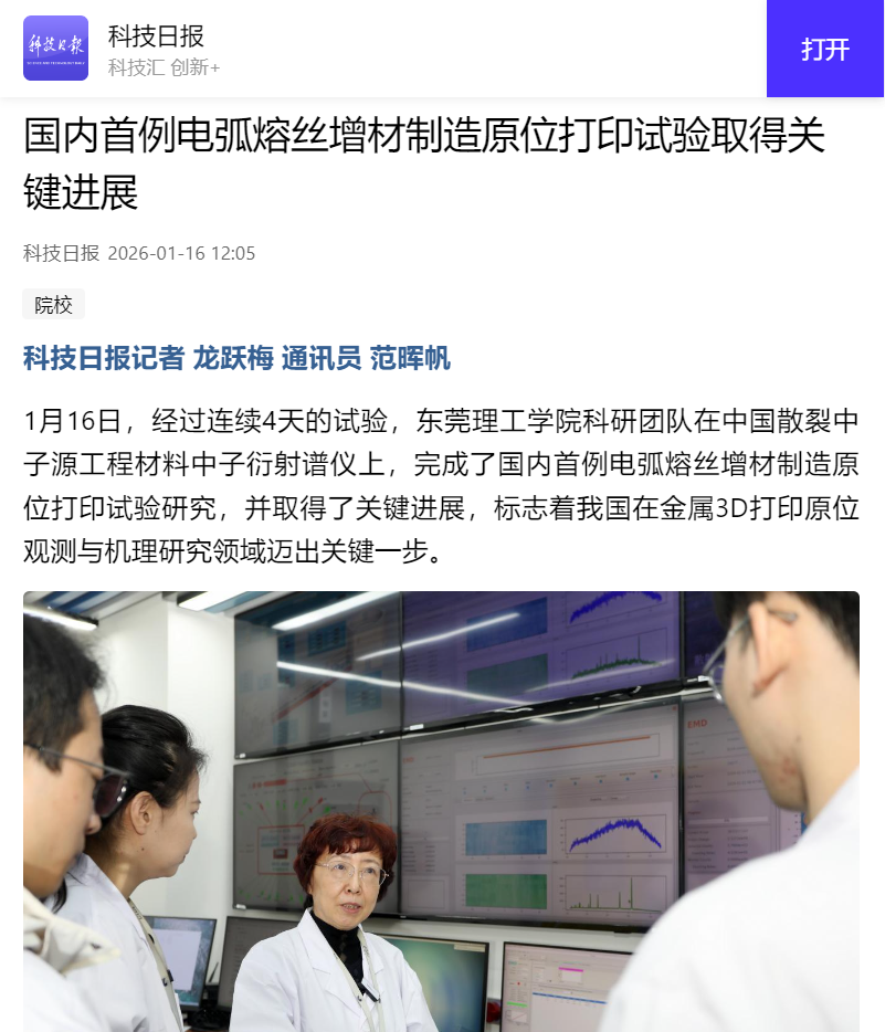 1月16日,经过连续4天的试验,东莞理工学院科研团队在中国散裂中子源工程材料中子衍射谱仪上,完成了国内首例电弧熔丝增材制造原位打印试验研究,并取得了关键进展,标志着我国在金属3D打印原位观测与机理研究领域迈出关键一步。
