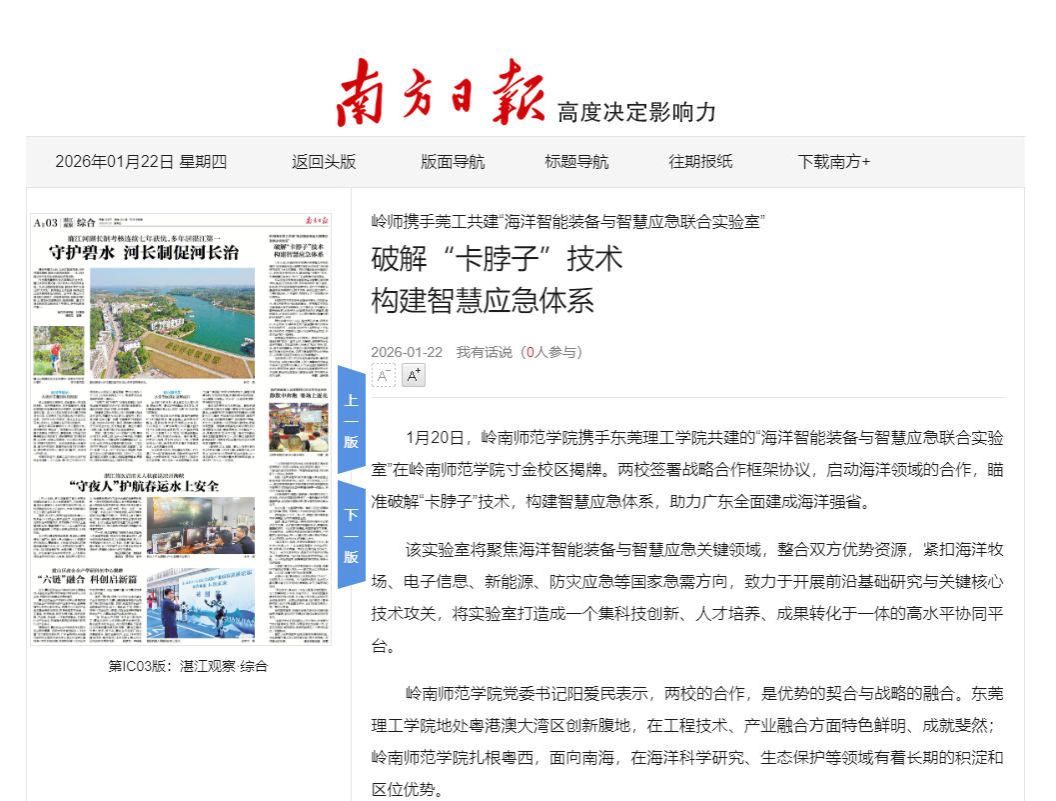 1月20日,岭南师范学院携手东莞理工学院共建的“海洋智能装备与智慧应急联合实验室”在岭南师范学院寸金校区揭牌。两校签署战略合作框架协议,启动海洋领域的合作,瞄准破解“卡脖子”技术,构建智慧应急体系,助力广东全面建成海洋强省。