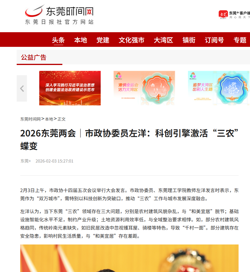 2月3日上午,市政协十四届五次会议举行大会发言。市政协委员、东莞理工学院教师左洋发言时表示,东莞作为“双万城市”,需特别以科技创新为突破口,推动“三农”工作与城市发展深度融合。