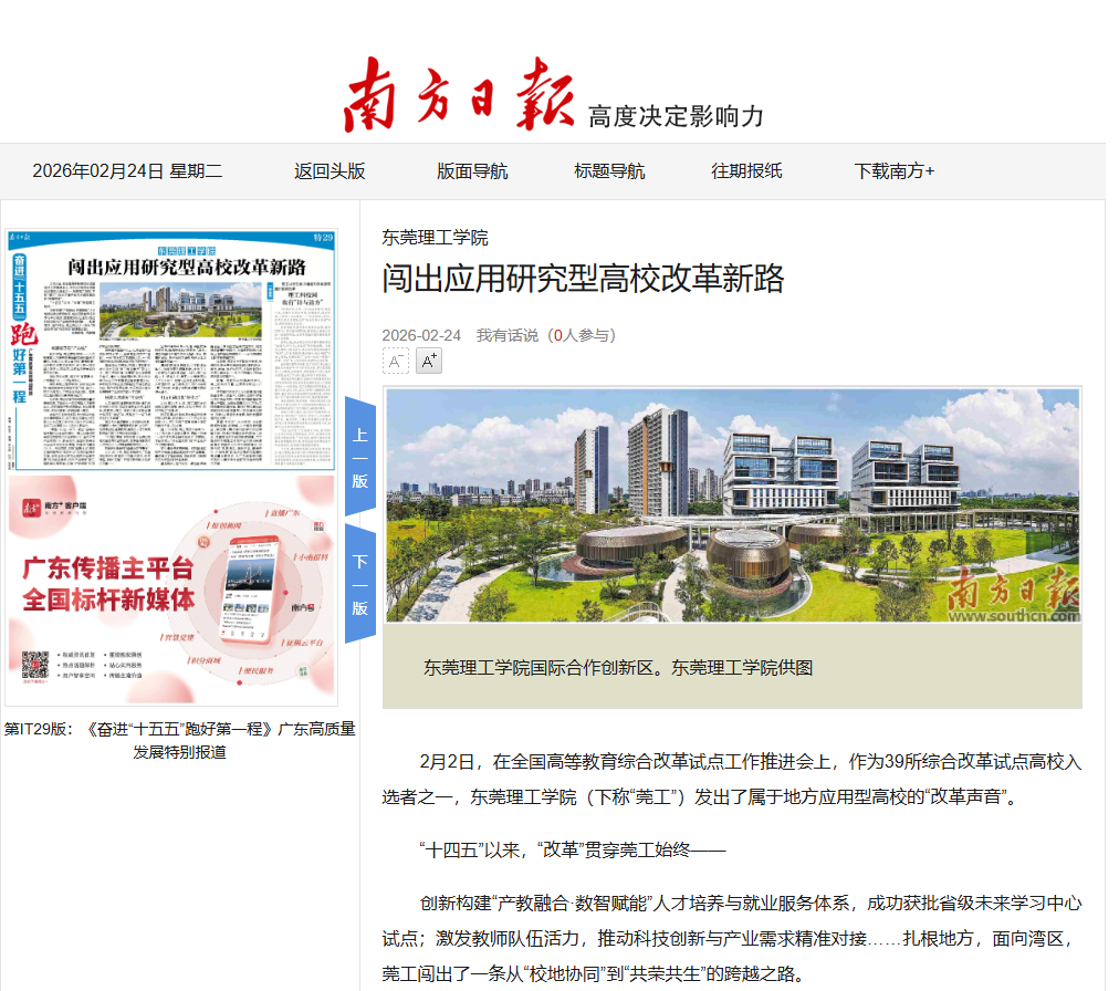 展望“十五五”,校方表示,将全面畅通教育链、创新链、人才链的有机融合,通过强化需求牵引的学科动态调整机制、构建产教融合的协同育人体系、完善有组织科研的制度保障,大力推进环东莞理工学院产业科技创新带和高水平国家级大学科技园建设,加快形成“扎根湾区、面向产业、融通中外、引领发展”的地方应用研究型高校高质量发展范式,为广东在推进中国式现代化建设中走在前列作出新的更大贡献。