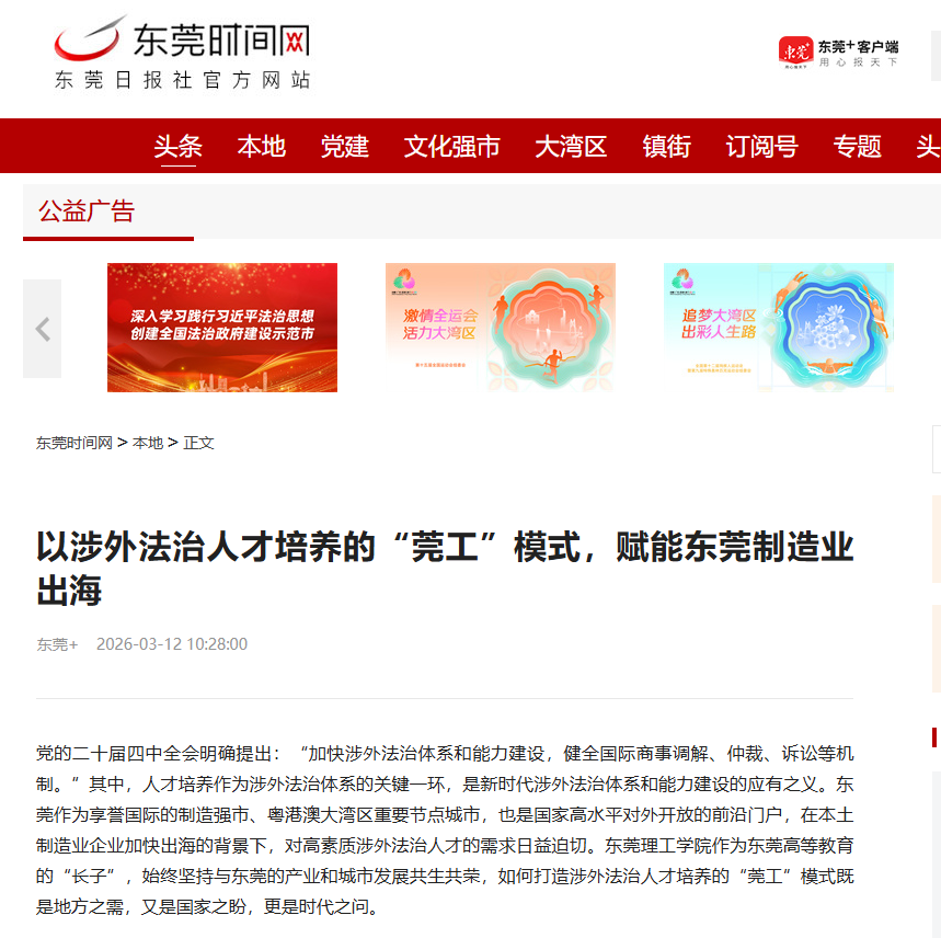 党的二十届四中全会明确提出:“加快涉外法治体系和能力建设,健全国际商事调解、仲裁、诉讼等机制。”其中,人才培养作为涉外法治体系的关键一环,是新时代涉外法治体系和能力建设的应有之义。东莞作为享誉国际的制造强市、粤港澳大湾区重要节点城市,也是国家高水平对外开放的前沿门户,在本土制造业企业加快出海的背景下,对高素质涉外法治人才的需求日益迫切。东莞理工学院作为东莞高等教育的“长子”,始终坚持与东莞的产业和城市发展共生共荣,如何打造涉外法治人才培养的“莞工”模式既是地方之需,又是国家之盼,更是时代之问。