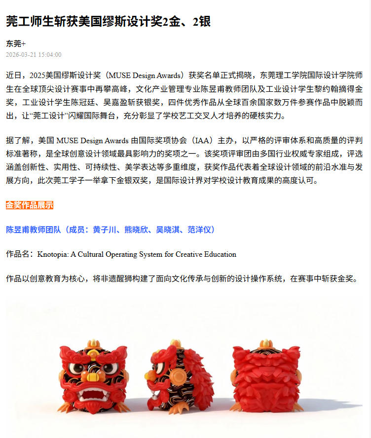 此次莞工师生在 MUSE 设计奖的优异表现,既是学校设计人才培养成果的生动体现,也彰显了“莞工设计”向国际化迈进的坚实步伐。东莞理工学院国际设计学院将继续深耕艺工交叉人才培养,持续深化产教融合、国际合作,以学行交替培养模式为抓手,打造大湾区高端设计人才培养高地,让更多青年设计新锐从莞工走出,用设计创意撬动新质生产力,为东莞打造“制造美学之城”、大湾区设计产业发展贡献莞工力量。
