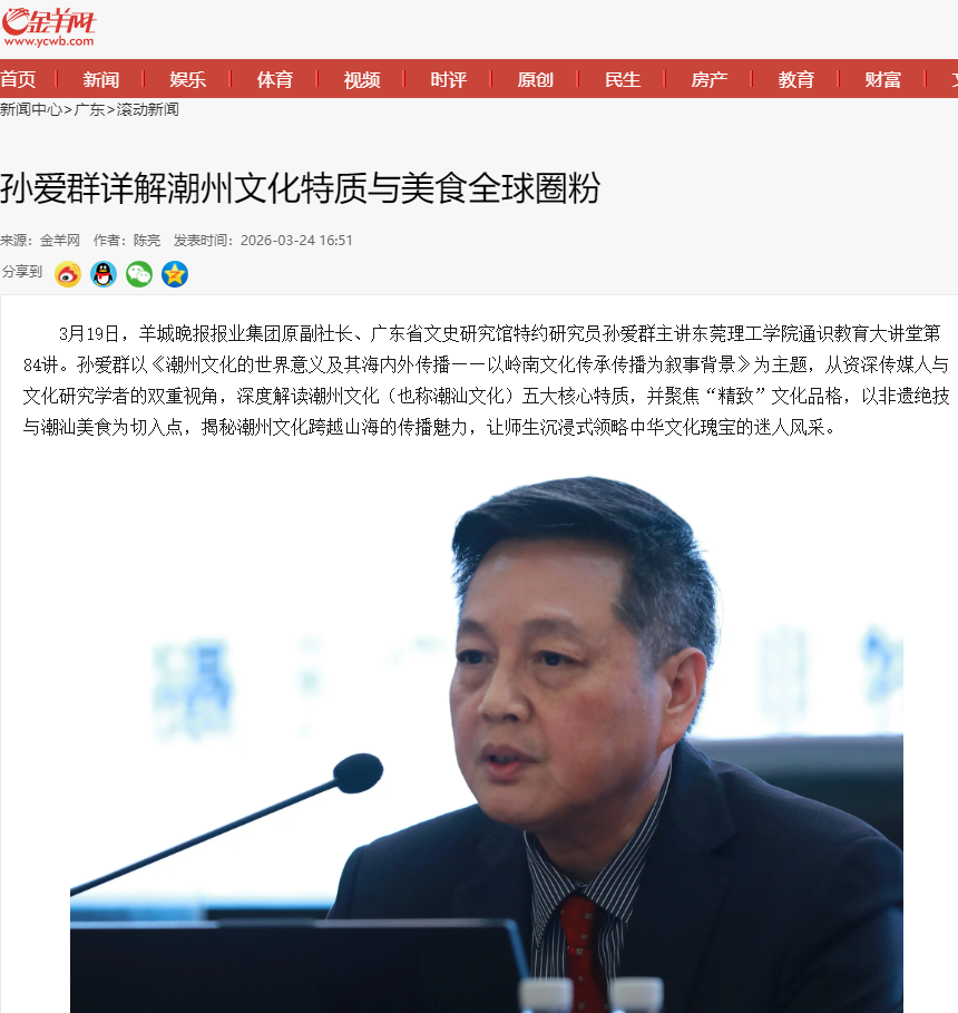 3月19日,羊城晚报报业集团原副社长、广东省文史研究馆特约研究员孙爱群主讲东莞理工学院通识教育大讲堂第84讲。孙爱群以《潮州文化的世界意义及其海内外传播——以岭南文化传承传播为叙事背景》为主题,从资深传媒人与文化研究学者的双重视角,深度解读潮州文化(也称潮汕文化)五大核心特质,并聚焦“精致”文化品格,以非遗绝技与潮汕美食为切入点,揭秘潮州文化跨越山海的传播魅力,让师生沉浸式领略中华文化瑰宝的迷人风采。