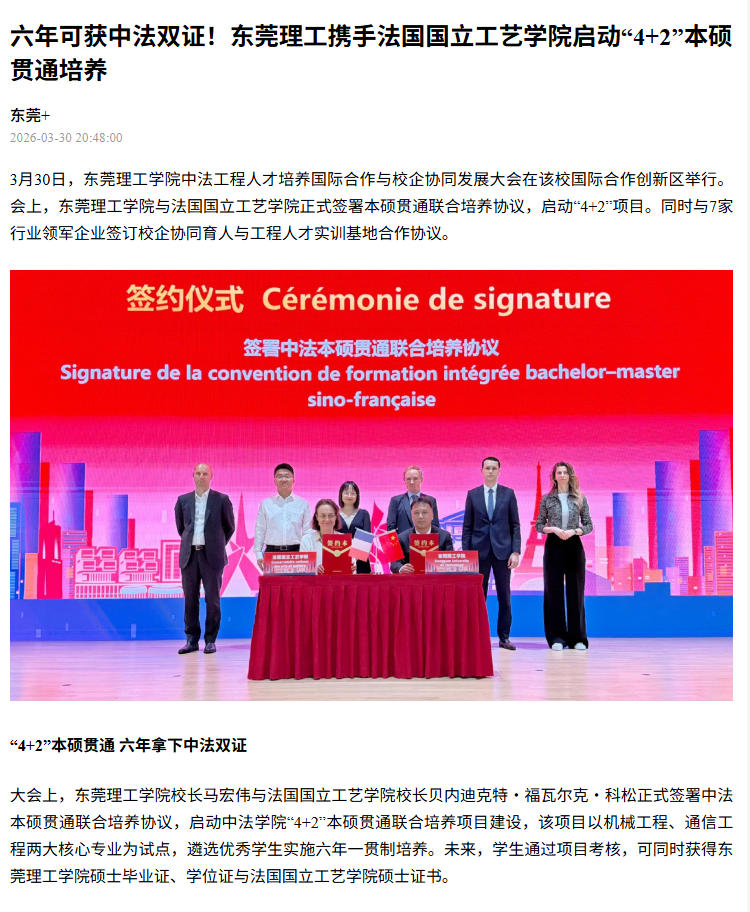 大会上,东莞理工学院校长马宏伟和法国国立工艺学院校长贝内迪克特・福瓦尔克・科松正式签署中法本硕贯通联合培养协议,启动中法学院“4+2”本硕贯通联合培养项目建设,尽快构建本硕直通、跨境培养的国际化人才成长“立交桥”。未来,学生通过该项目可同时获得东莞理工学院硕士毕业证、学位证与法国国立工艺学院硕士证书,拿下中法双证。