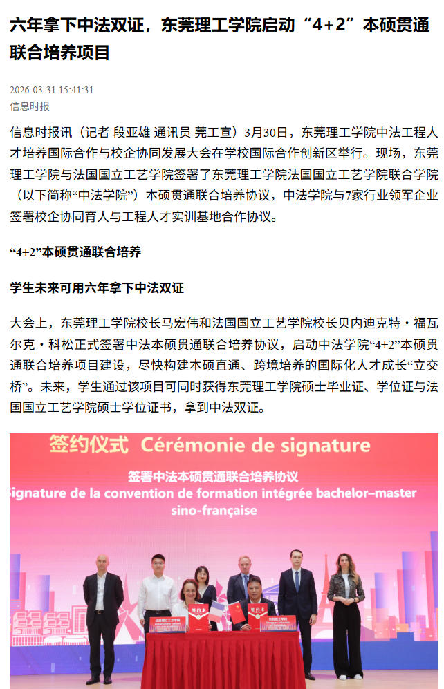 信息时报讯(记者 段亚雄 通讯员 莞工宣)3月30日,东莞理工学院中法工程人才培养国际合作与校企协同发展大会在学校国际合作创新区举行。现场,东莞理工学院与法国国立工艺学院签署了东莞理工学院法国国立工艺学院联合学院(以下简称“中法学院”)本硕贯通联合培养协议,中法学院与7家行业领军企业签署校企协同育人与工程人才实训基地合作协议。