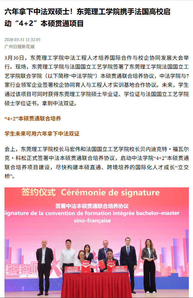 3月30日,东莞理工学院中法工程人才培养国际合作与校企协同发展大会举行。现场,东莞理工学院与法国国立工艺学院签署了东莞理工学院法国国立工艺学院联合学院(以下简称“中法学院”)本硕贯通联合培养协议,中法学院与7家行业领军企业签署校企协同育人与工程人才实训基地合作协议。未来,学生通过该项目可同时获得东莞理工学院硕士毕业证、学位证与法国国立工艺学院硕士学位证书,拿到中法双证。